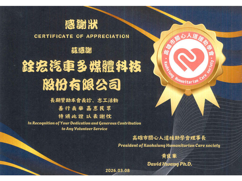 銓宏汽車多媒體科技股份有限公司很榮幸於2026年3月8日,獲得高雄市關心人道援助學會頒發之感謝狀,肯定本公司長期投入義診與志工活動的參與與支持。